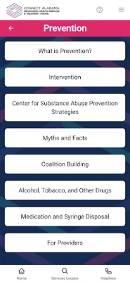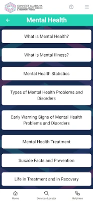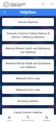 The Connect Alabama is a free application that is a convenient resource for information and services related to behavioral health.The providers you will find on our app are licensed providers who specialize in treating substance abuse, addiction, mental health and prevention. We have also provide you a selection of crisis hotlines that are easily and accessible and confidential.