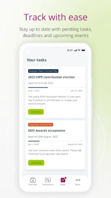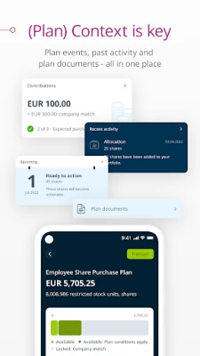 The app provides an easy-to-read overview of your equity compensation plan(s)’s value and performance, and a comprehensive overview of all relevant and plan-related events. You can enter and manage trades, and access your elections, documents, statements and agreements.