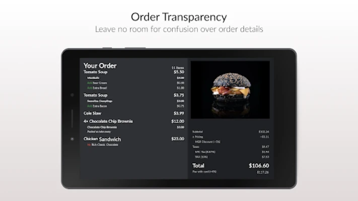 Features: Display order details: options, taxes, discounts, totals Display cash discount and card surcharge Show order changes to your customer in real-time Pair easily with Figure POS by scanning a QR code Ability to sign and tip Ability to enter an email address for digital receipts Ability to suggest other products