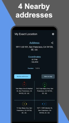 Application that will show you your current location in real time by telling you the postal address you are currently at (street name, street number, city, zip code and country), as well as showing you four nearby addresses, the exact coordinates in latitude and longitude by GPS.