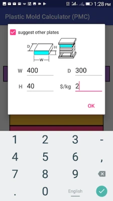 2-The app allows you to input the size of the platesmanually including its price per kg.