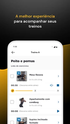 Seu treino é criado através de informações oferecidas por você em um questionário detalhado, conhecido como anamnese. Com o treino sob medida na palma da sua mão, você vai acompanhar a sua evolução com dados de carga, repetições e orientações valiosas para melhorar seu condicionamento físico.