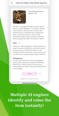 • Check market value: Get price checks and resale values for items you buy and sell on platforms like eBay, Etsy, Facebook Marketplace, and Vinted.